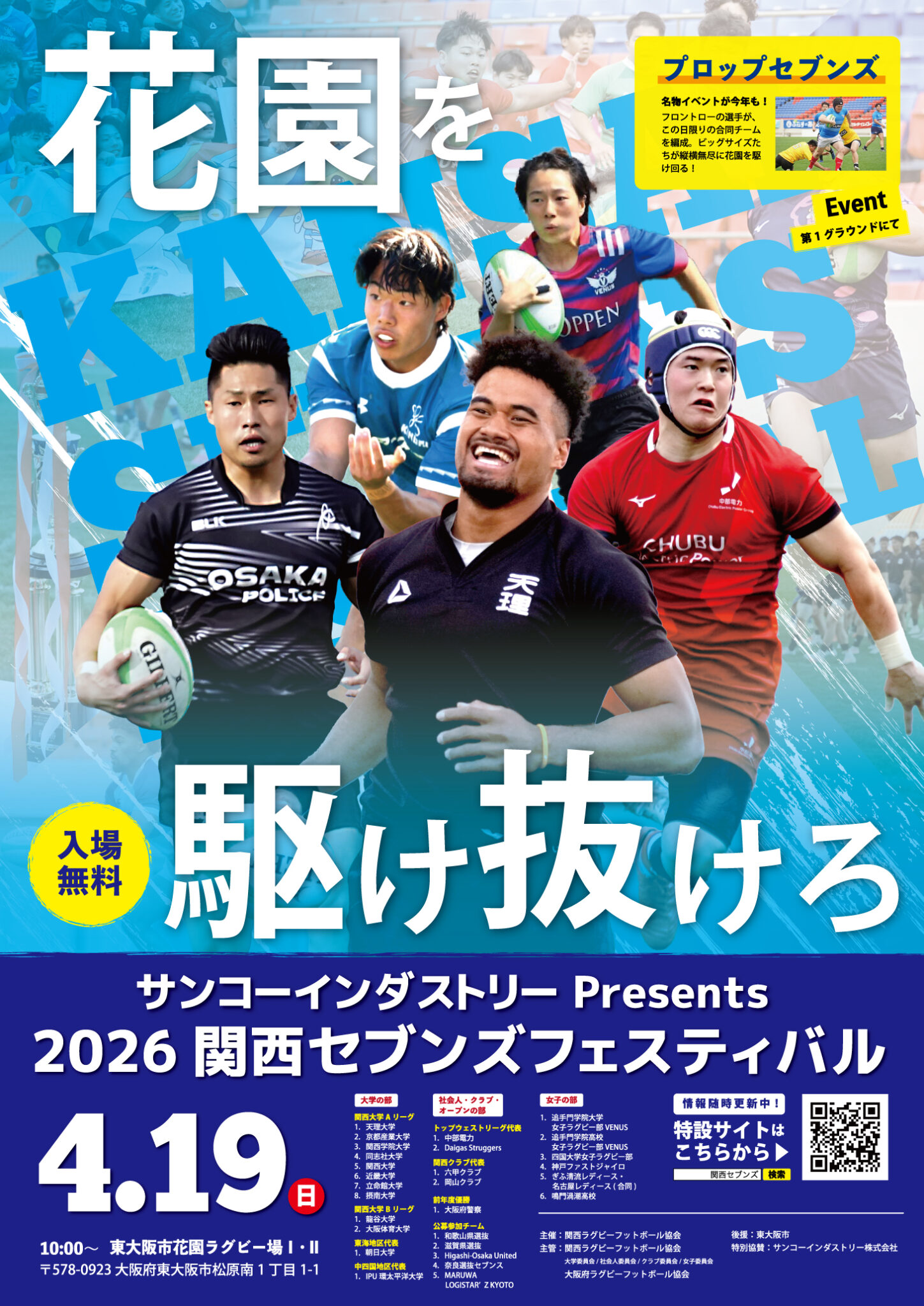4/14(日)花園ラグビー場にて行われる「サンコーインダスト リーPresents2024関西セブンズフェスティバル」の《女子の部》に出場いたします!■1試合12:40~ vs四国大学■2試合目14:20~vsアザレア・セブン 神戸ファストジャイロの応援をどうぞよろしくお願いします!